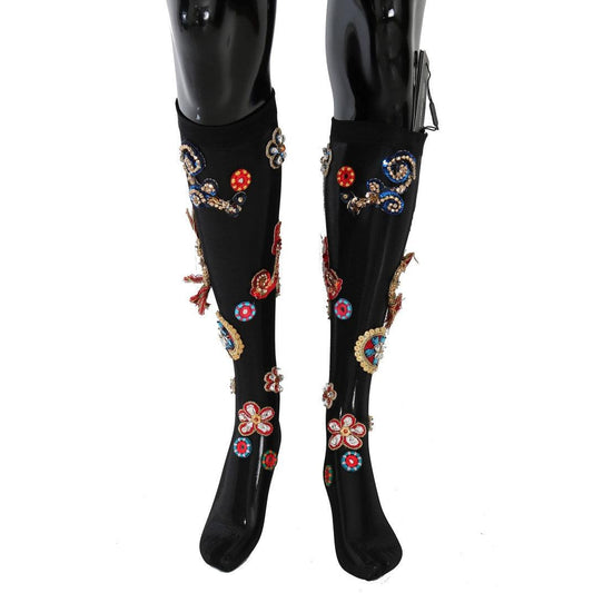 Dolce & Gabbana Black Knitted Floral Clear Crystal Socks