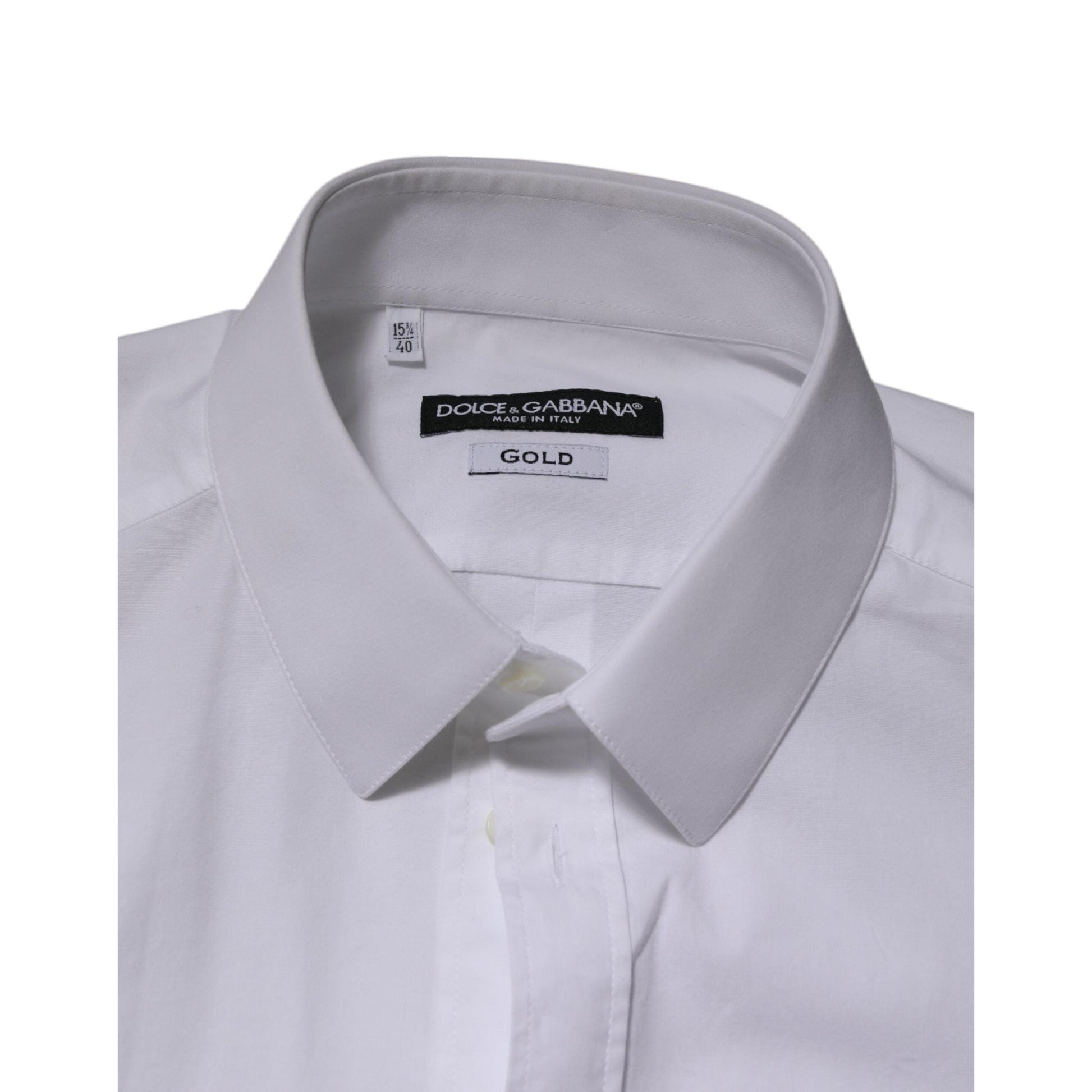 Fremstillet af 100% premium bomuld sikrer ikke kun uovertruffen komfort, men også et let og åndbart materiale. Dolce & Gabbana's White Cotton GOLD Long Sleeves Formal Men Shirt beviser, at det moderne mandlige klædeskab også kan indeholde skjorter med en klassisk snit. Med et længere snit, fås den i størrelse M og L.